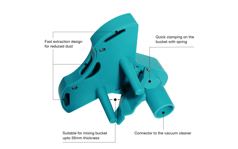 Die BIHUI Staubabsaugung für Eimer TDBM ist die perfekte Lösung für staubfreies Arbeiten beim Anmischen von Fliesenklebern, Spachtelmassen oder Estrichen. Dank der Schnellmontage mit Federmechanismus lässt sich das System in wenigen Sekunden an nahezu jedem handelsüblichen Eimer befestigen.