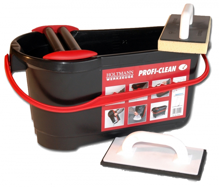 Der Wascheimer Profi Clean Holtmann (24 L) ist auf das Auswaschen von Schwammbrettern beim Verfugen ausgelegt. Die langgezogene Bauform erleichtert das Einführen des Schwammbretts, zwei Abstreifwalzen sorgen für schnelles, gleichmäßiges Ausdrücken. Die nach hinten abfallende Bodenkontur ermöglicht das Absetzen von Schwebstoffen (Fugenmörtel), während ein großer Bodenradius das Entfernen des Bodensatzes erleichtert. Der verschiebbare Griff klappt hinter den Eimerrand und stört nicht beim Arbeiten.